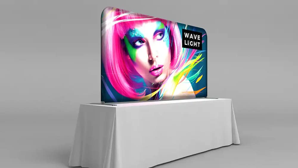 The WaveLight® LED Table Top Display uses bright LED backlighting to illuminate high resolution fabric graphics. This lighting enhances colour vibrancy and clarity, making branding, logos, and marketing messages stand out clearly even in busy exhibition environments.